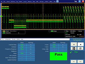 作為模擬分量視頻信號(hào)分析的最終解決方案,VM6000具有視頻保真度、信號(hào)質(zhì)量和標(biāo)準(zhǔn)符合性的全面特性。利用它的選件,VM6000能夠自動(dòng)評(píng)定視頻信號(hào)的符合性,它支持的視頻標(biāo)準(zhǔn)有:EIA-770.x、SMPTE-274M、296M 和VESA VSIS標(biāo)準(zhǔn)。在對(duì)傳統(tǒng)的"TV"信號(hào)保真度進(jìn)行評(píng)測(cè)時(shí),它使用業(yè)內(nèi)公認(rèn)的測(cè)量參數(shù),可以自動(dòng)進(jìn)行大約150個(gè)單項(xiàng)測(cè)量,并在不到20 秒的時(shí)間內(nèi)完成。在對(duì)PC 圖形信號(hào)信號(hào)保真度進(jìn)行評(píng)測(cè)時(shí),VM6000可以按照VSIS 測(cè)試規(guī)程對(duì)RGB視頻和HV 同步測(cè)量參數(shù)進(jìn)行測(cè)量。VM6000能夠預(yù)先加載基準(zhǔn)文件和容限測(cè)試文件,以便進(jìn)行合格/ 不合格的質(zhì)量評(píng)價(jià),它適用于DMT、CVT 或GTF 定時(shí)標(biāo)準(zhǔn)。