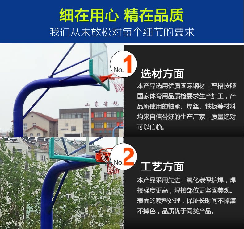 菏澤移動(dòng)箱式籃球架有些時(shí)候籃球運(yùn)動(dòng)的內(nèi)在價(jià)值,經(jīng)遠(yuǎn)遠(yuǎn)超出強(qiáng)身健體的控制之內(nèi),在當(dāng)代已經(jīng)被人們所認(rèn)知,籃球運(yùn)動(dòng)不僅對(duì)青少年有著良好的社會(huì)行為規(guī)范和教育作用,而且對(duì)整個(gè)社會(huì)有多層次教育的價(jià)值,對(duì)現(xiàn)代社會(huì)而言,籃球運(yùn)動(dòng)無疑是一項(xiàng)既能健身娛樂又能促進(jìn)社會(huì)文明進(jìn)程的良好競(jìng)技運(yùn)動(dòng)項(xiàng)目。 學(xué)校專用籃球架尺寸、規(guī)格以下幾點(diǎn)就是標(biāo)準(zhǔn):籃圈使用實(shí)心鋼制材料,直徑在16 mm -20 mm,籃板面距離立柱不能小于600mm,網(wǎng)長(zhǎng)在40cm-45cm,高度為2050mm-2350mm,籃板面距離籃圈內(nèi)沿最近點(diǎn)距離為148 mm -152 mm, 對(duì)角線之差在6-8mm,保護(hù)邊框同上?;@架主體支撐部分為鋼材,伸臂臂厚不得小于2.5mm.立柱臂厚不得小于4mm,籃板背后距地面小于1.8m高度的任何籃球架懸臂與支撐部分應(yīng)經(jīng)襯添后包扎,包扎厚度不小于2.5cm,在籃板背后的任何支撐部分要在其下表面包扎,直到距籃板正面80cm處。