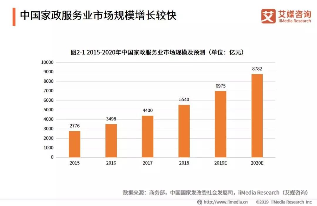 2017年中國家政服務行業(yè)營業(yè)收入達到4400億元,同比增長26.0%,2015-2017三年年均復合增長率為25.9%。iiMedia Research(艾媒咨詢)測算,到2020年中國家政服務業(yè)市場規(guī)模將達到8782億元。