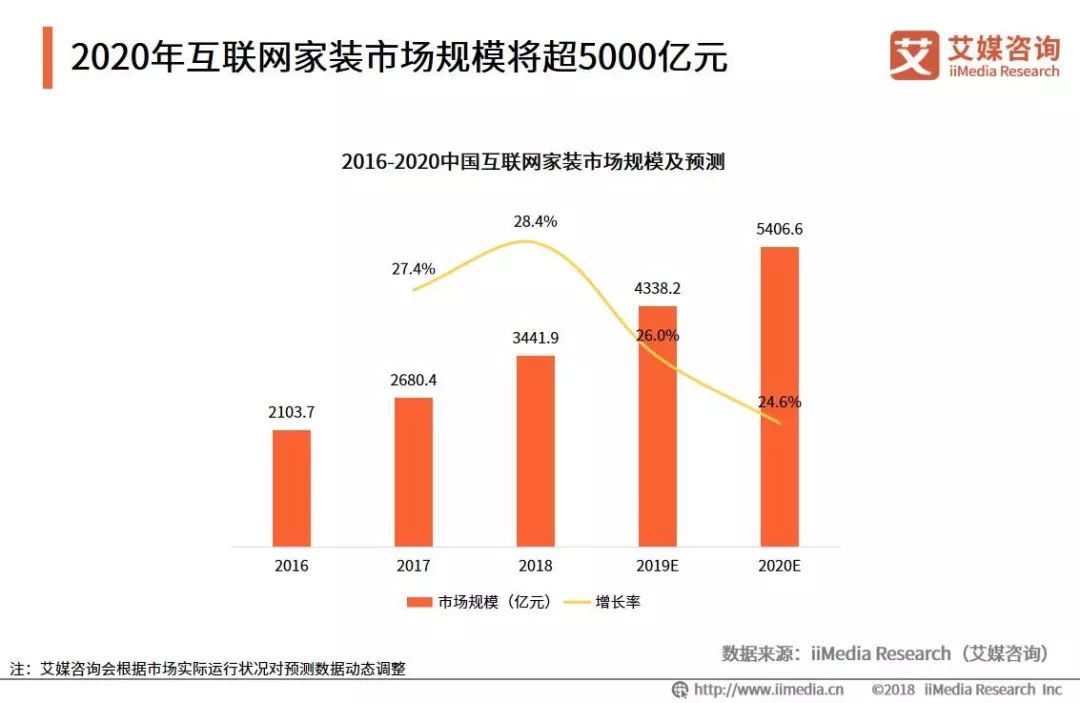 iiMedia Research(艾媒咨詢)數(shù)據(jù)顯示,2018年中國互聯(lián)網(wǎng)家裝市場規(guī)模已達到3441.9億元,預計2019年將達到4338.2億元,將保持較高的速度繼續(xù)增長,在2020年將超過5000億元。